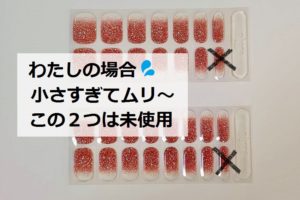 できるだけ、親指には①の中から選ぶ、中指には②の中から選ぶ、というように、少しサイズが合わないものでも伸ばしたり、端を少しカットしたりして使えば、シールを全体的に消費していくことができます。