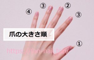 人にもよりますが、一般的に爪のサイズは大きい順に、 ① 親指 → ② 中指 → ③ 人差し指・薬指 → ④ 小指 です。