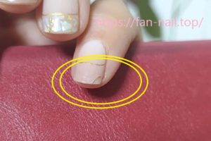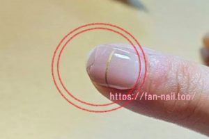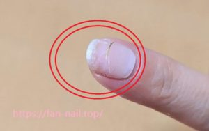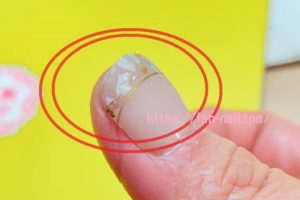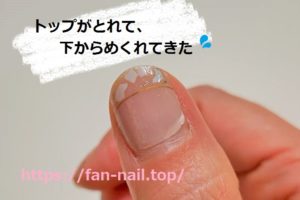 でも、よく見ると、ネイルはかけてるんですが、ネイルの色は爪に乗ったままになっている。たぶん、上の硬いところだけ割れて落ちちゃったのかも?